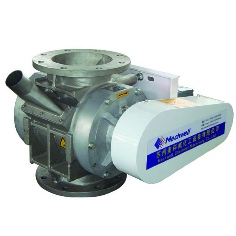 物料從上部料斗下落到星形葉片之間,然后隨葉片旋轉至旋轉閥下部,憑借重力從出料口卸出。